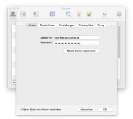 | aktuell | 16:38, 12. Okt. 2014 | 706 × 629 (63 KB) | Max (Diskussion | Beiträge) | Kontenverwaltung von Adium unter Mac OS X |